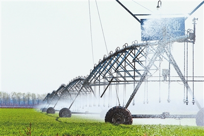 浚县高标准农田里,自走式喷灌机在为小麦浇水。 新华社发