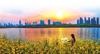 市民在风光旖旎的淇河岸边写生。 刘宏星 摄