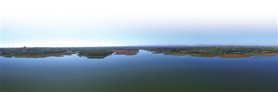 鹤鸣湖水平如镜,天空湛蓝无垠,自然与人文景观交相辉映。