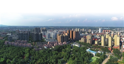 蓝天白云下的山城区绿意环绕,生机勃勃。