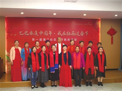 第一届浦江社区春节联欢活动现场,社区居民表演合唱的温馨时刻。