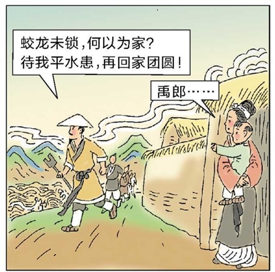 大禹率领治水队伍行经自家门口。他的妻子涂山氏抱着孩子站在门前,眼中充满期盼。