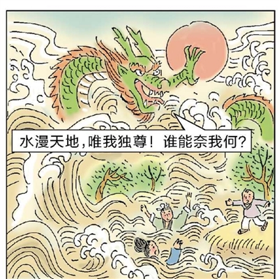 乌云翻滚,浪涛汹涌,一条凶恶的蛟龙在黄河里翻腾,得意地掀起巨浪,百姓在洪水中挣扎。