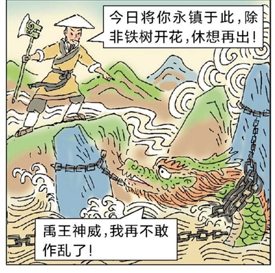 大禹与蛟龙激战,最终将蛟龙打入深井,投下巨柱将其锁住。