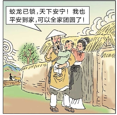 云开日出,风调雨顺,田野一片生机。大禹终于推开家门,妻子笑脸相迎,孩子在大禹怀中欢笑。