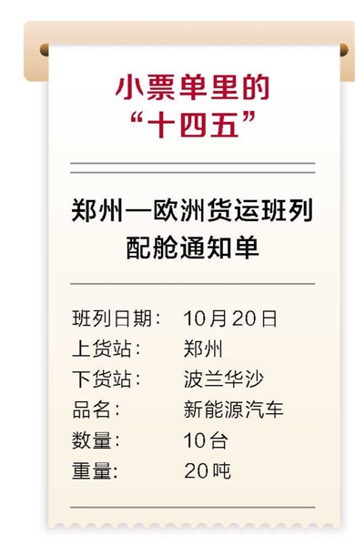 10月16日,中豫港务集团郑州国际陆港的配舱通知单上,中英文双语记录着这样一条中欧班列的订舱信息:班列日期10月20日,上货站郑州,下货站波兰华沙,品名新能源汽车,数量10台。