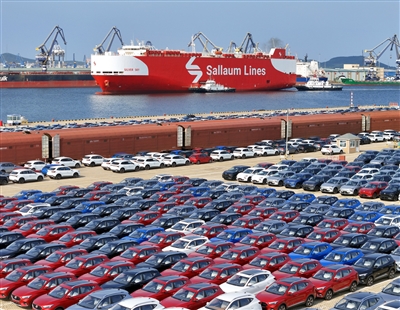 国产汽车在山东港口烟台港集结等待装船出口(无人机照片)。 新华社发(唐克 摄)