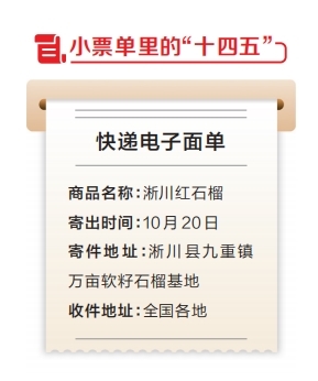 10月20日下午4点30分,淅川县九重镇万亩软籽石榴基地,工作人员将打包好的软籽石榴贴上快递电子面单。不久后,这些石榴就会按照面单上的地址被送往全国各地。