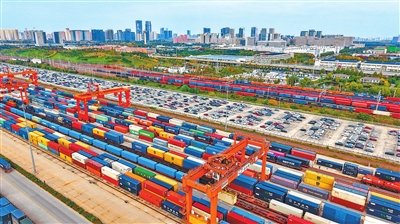 10月21日,位于中国铁路郑州局集团有限公司圃田站的中铁特货作业区一片繁忙,商品车专列正进行装车作业。连日来,中铁特货郑州分公司迎来商品车出口运输高峰,通过增开至连云港等方向的密集班列,以“铁路+海运”联运模式将商品车销往全球90多个国家和地区。 本报记者 聂冬晗 摄