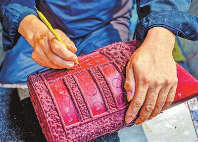 烟涧村青铜器制作工坊的匠人在用蜡制作模板。