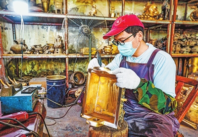 烟涧村青铜器制作工坊的匠人在专注雕刻黄铜器物。