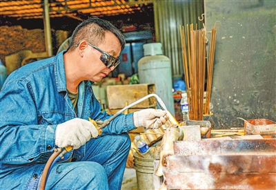 烟涧村青铜器制作工坊的匠人在进行焊接。