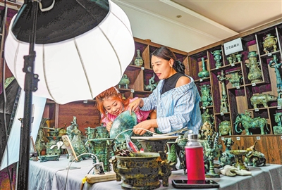 暮色中,武汉游客孙女士挑花了眼;作坊内,年轻学徒举起刚打磨好的爵杯,杯身蟠螭纹在灯光下流转;数十个直播间聚光灯耀眼,用数字与流量将青铜文化传向全球。烟涧村的青铜密码清晰可见:传统工艺传承发展,不是抛弃历史,而是以匠心守初心、以文化延未来,在古今交融中续写文明新篇。