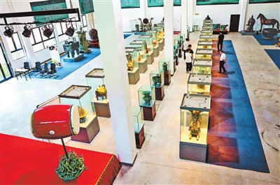 游客在琳琅满目、工艺精美的青铜产业园展厅里参观。
