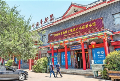 游客走进洛阳烟云涧青铜工艺博物馆参观。