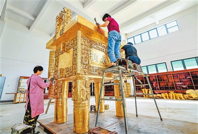 在青铜产业园生产车间,工人们正在精心打造一尊大型铜鼎。