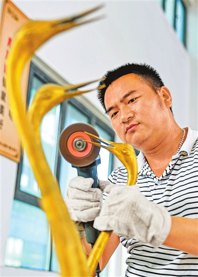 青铜产业园的工人正对铜质仙鹤的喙部等进行细节打磨。
