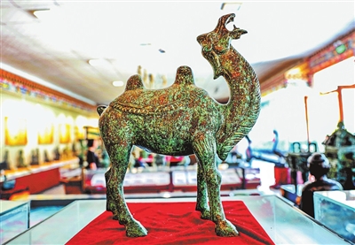 洛阳烟云涧青铜工艺博物馆内的青铜骆驼展品,造型生动、头部姿态昂扬,仿佛正昂首嘶鸣。