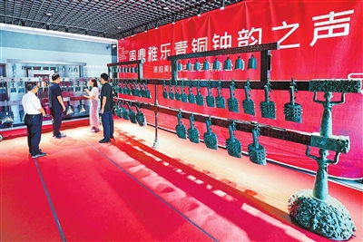 洛阳周鼎仿古工艺有限公司展厅里,几名参观者正驻足观赏,听该公司经理袁媛介绍古代乐器编钟。