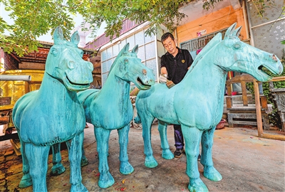 洛阳周鼎仿古工艺有限公司的工人手持工具,仔细地为三匹造型生动的铜马刷漆。