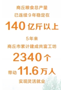 金秋时节,广袤的田野上,丰收景象如诗如画。商丘粮食总产量已连续9年稳定在140亿斤以上。