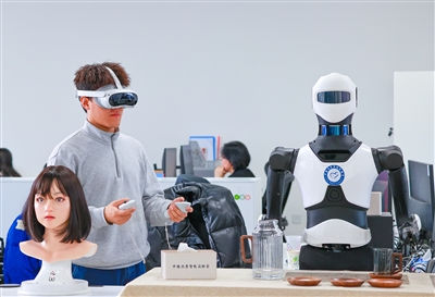 中豫具身智能实验室研发的人形机器人在为客人倒水。本报记者 聂冬晗 摄