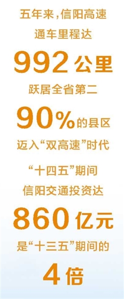 五年来,信阳高速建设持续提速。沿大别山高速等9条公路相继开工、通车,“五纵三横一环”高速公路网络贯通全域,通车里程达992公里,跃居全省第二。90%的县区迈入“双高速”时代,近九成乡镇实现“二十分钟上高速”,为山货出村、工业下乡铺就坦途。