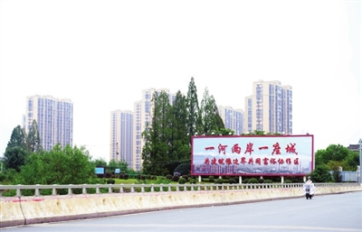 叶集、固始交界处共建“一河两岸一座城”的巨幅标牌鼓舞人心。韩蕾 摄