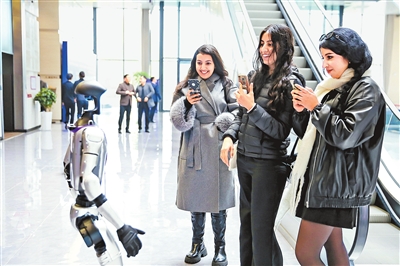 ⑤担任迎宾的机器人“创小港”憨态可掬,引得与会人员纷纷与之合影、互动。本版图片均为河南日报社全媒体记者 徐聪 摄