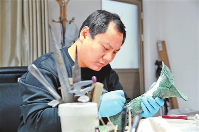 范智泓在修复一件青铜器。本报记者 王铮 摄