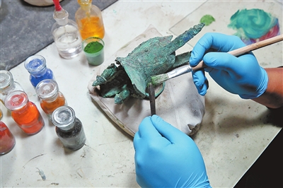 范智泓在为青铜器上色。本报记者 王铮 摄