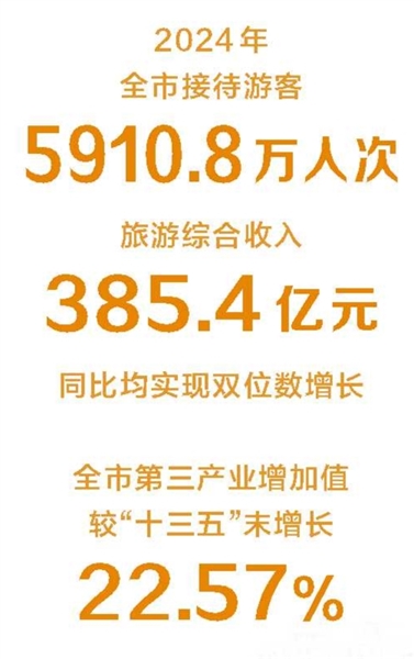 2024年,全市接待游客5910.8万人次,旅游综合收入385.4亿元,同比均实现双位数增长。2024年,平顶山第三产业增加值较“十三五”末增长22.57%。