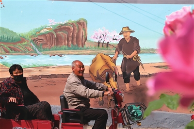 老两口从庙底村农耕文化墙路过。闫增旗 摄