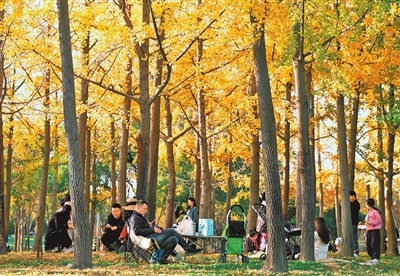 11月1日,周末,河南迎来入秋以来难得的晴天,郑州市民走出家门,在北龙湖湿地公园欣赏秋色,阳光洒在林间,成为一道亮丽风景。