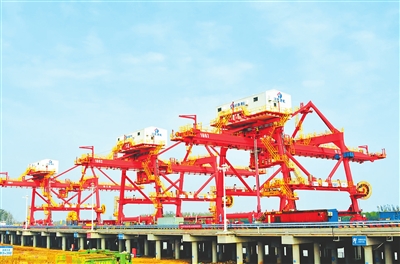 10月18日,秋雨初歇,沙颍河畔的周口中心港小集作业区(一期)建设现场,首批三台岸桥(码头集装箱起重机)正在紧锣密鼓通电调试,第四台岸桥已通过港池直接吊运至码头前平台,开始大梁安装;第五台岸桥正从上海奔赴而来。