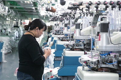 谭庄镇农民工返乡创业园区谭庄袜业车间内,工人在自动化针织机旁整理袜子。