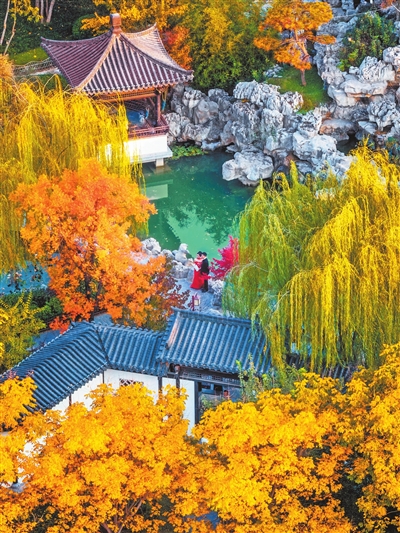 11月2日,郑州南环公园里的苏园被金黄和橘红的树叶包围,空气里都是秋天的味道。园里的亭台、水面和树木相映成趣,像一幅安静的画。