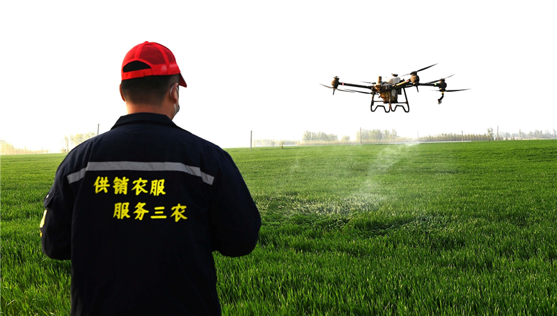 沁阳市供销社三农服务队利用植保无人机为麦田喷洒杀虫剂和营养剂。 本报资料图片