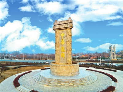 濮阳市标志性文化地标龙碑,与1987年西水坡遗址出土的“中华第一龙”蚌塑龙虎图案相呼应。