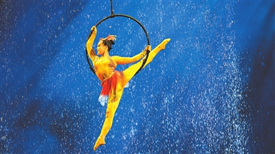 《水秀》演出现场,杂技演员在表演《水中吊环》节目。 僧少琴 摄
