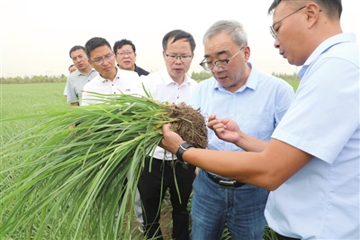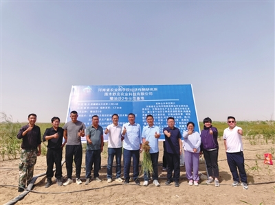 河南省农科院专家在新疆生产建设兵团第三师五十四团察看河南省农科院油莎豆试验基地品种对比试验长势情况。