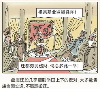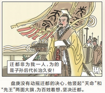 西汉司马迁《史记·殷本纪》:帝盘庚之时,殷已都河北,盘庚渡河南,复居成汤之故居,乃五迁,无定处。殷民咨胥皆怨,不欲徙。盘庚乃告谕诸侯大臣曰:“昔高后成汤与尔之先祖俱定天下,法则可修。舍而弗勉,何以成德!”乃遂涉河南,治亳,行汤之政,然后百姓由宁,殷道复兴。