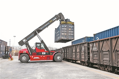 位于博爱县的山东港口豫北内陆港,员工用正面吊把发往山东港口青岛港的货物装火车发运。 程全 摄