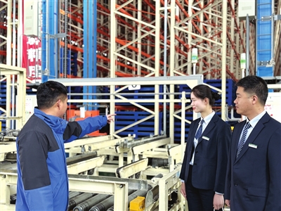 邮储银行三门峡市分行信贷客户经理在某电子智能化立体仓库回访服务场景。