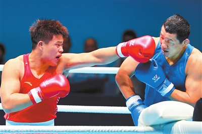 11月14日,在第十五届全运会竞技体育男子拳击92公斤级决赛中,河南队运动员韩雪振(左)夺得金牌。