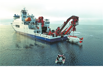 “奋斗者”号及其母船“探索三号”则实现了极区深潜科考作业的船载/潜载国产技术的突破,并开创了在北极密集冰区“船潜协同”的移动式冰潜新模式,使我国成为目前世界上唯一在北极密集海冰区进行连续载人深潜的国家。