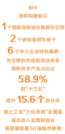 如今,洛阳构建起以1个国家级制造业集群为引领、2个省级集群为骨干、6个中小企业特色集群为支撑的先进制造业体系,高新技术产业占比达58.9%,较“十三五”提升15.6个百分点,规上工业“三化改造”全覆盖,成功进入全国制造业高质量发展50强城市榜单。