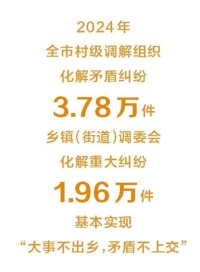 司法行政系统贯彻落实“大司法行政”理念,全面提升司法所履职能力。2024年,全市村级调解组织化解矛盾纠纷3.78万件,乡镇(街道)调委会化解重大纠纷1.96万件,基本实现“大事不出乡,矛盾不上交”。人民调解成为平安建设的“第一道防线”。