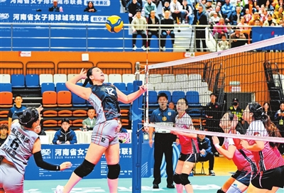 豫排联赛赛场上,航空港区队员大力扣杀。