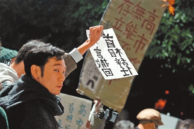 11月21日,在日本东京的首相官邸外,民众抗议日本首相高市早苗近日在国会发表的涉台错误言论,要求其撤回相关表态并作出解释和道歉。 新华社记者 贾浩成 摄